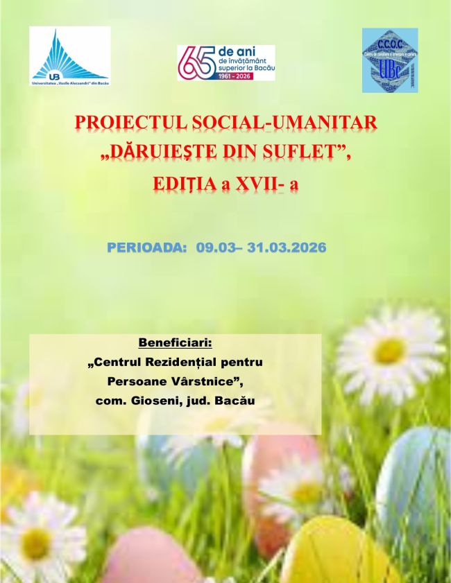 În perioada 09.03-31.03.2026, Centrul de Consiliere și Orientare în Carieră din cadrul Universității „Vasile Alecsandri” din Bacău, a desfășurat proiectul social-umanitar „Dăruiește din suflet”, ajuns la ediția a XVII-a.